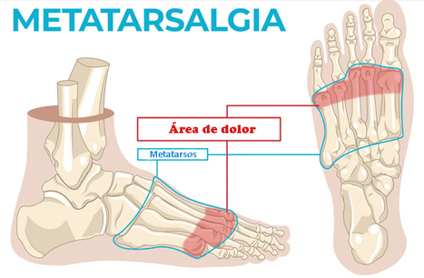 La metatarsalgia es el dolor en la región anterior del pie (ver la zona de dolor en la figura). Es en definitiva dolor de los huesos metatarsos.